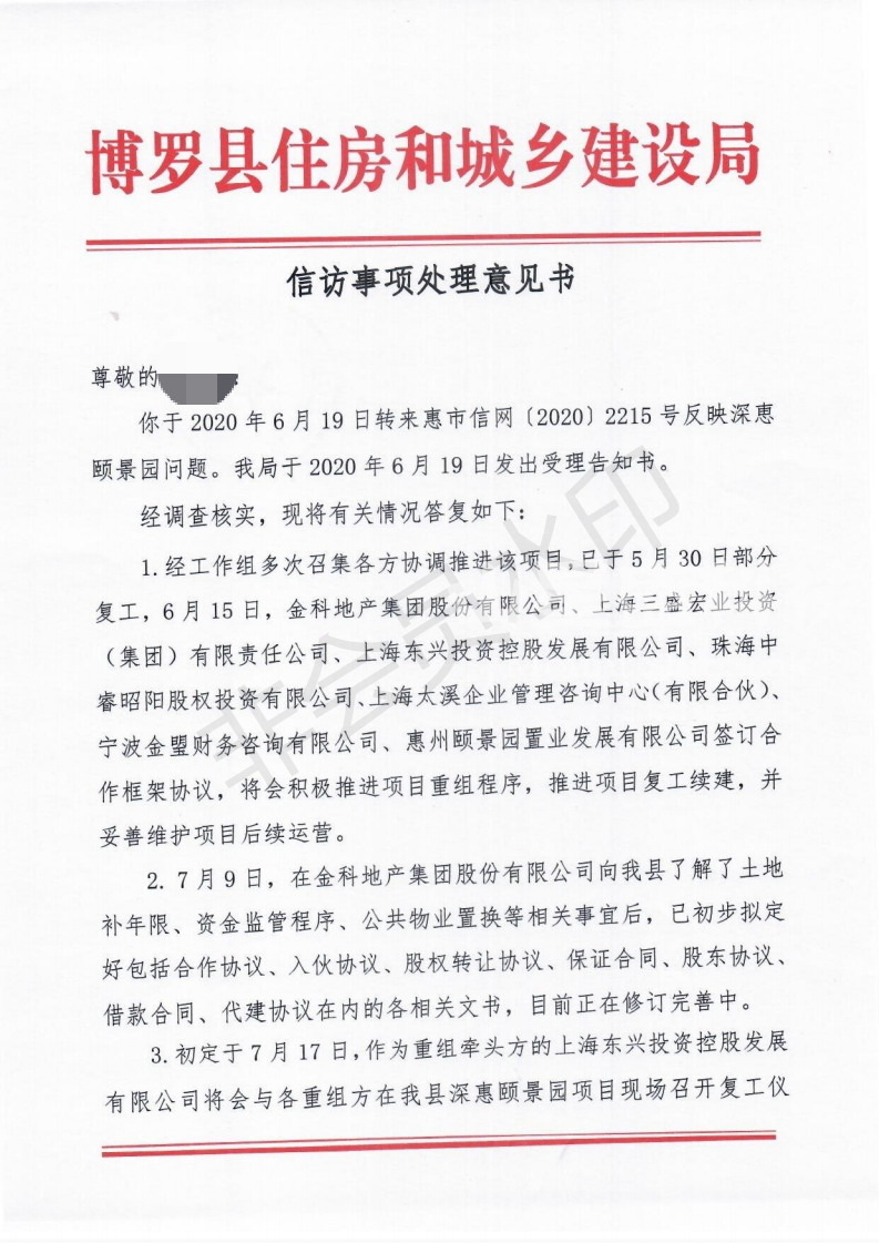 博羅縣問題樓盤工作組列出了項(xiàng)目復(fù)工時(shí)間表,要求項(xiàng)目重組方4月30日前拿出重組方案,盡快推動(dòng)項(xiàng)目復(fù)工。5月6日,重組方三盛惠州項(xiàng)目重組小組已正式遞交《項(xiàng)目重組方案》,擬設(shè)立紓困基金下設(shè)專項(xiàng)管理公司統(tǒng)一接管項(xiàng)目公司,快速安排項(xiàng)目復(fù)工、債權(quán)清償、項(xiàng)目運(yùn)營(yíng)、財(cái)務(wù)管控等事項(xiàng),盡快落實(shí)資金,力爭(zhēng)5月30日前達(dá)到復(fù)工條件。