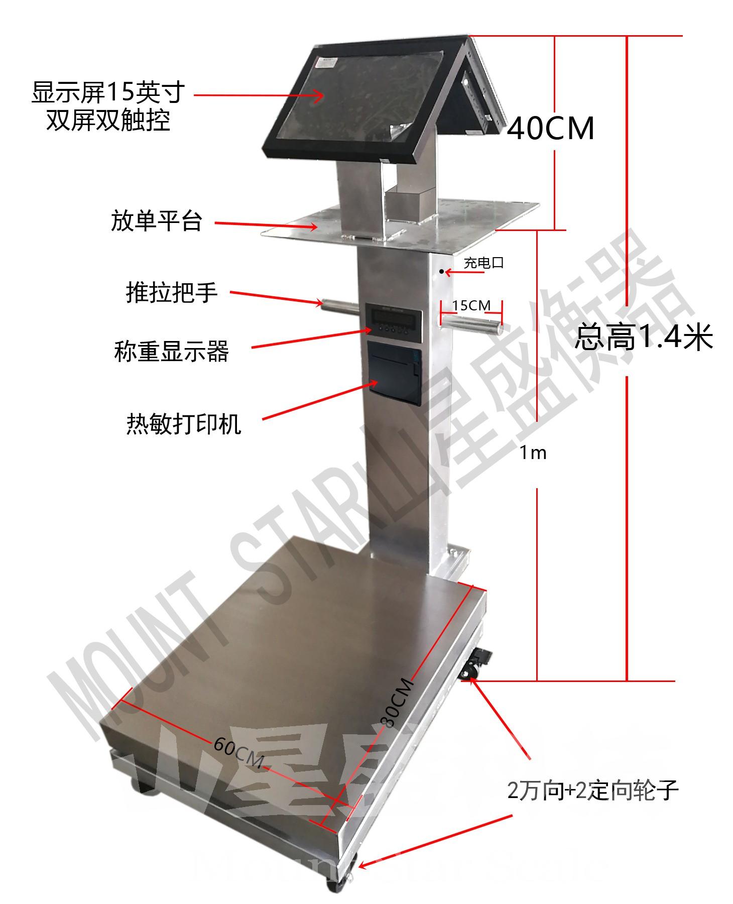 追溯源安卓Android微軟WIN7操作系統標簽打印APK電子稱exe軟件多功能一體電子秤是在電子秤的基礎上加裝多種選配件組裝成,由15寸雙觸膜顯示器+打印機+充存電+攝像頭+掃碼裝置等
